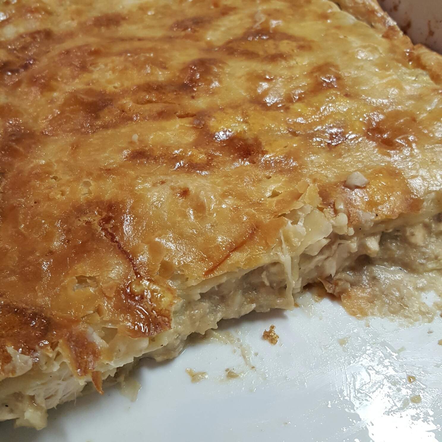 - βγαζουμε το ταψι απο τον φουρνο και βαζουμε μεσα την γεμιση απλωνοντας την ομοιομορφα και τοποθετουμε απο πανω το αλλο φυλλο και το διπλωνουμε καλα στις ακρες για να κλεισει.